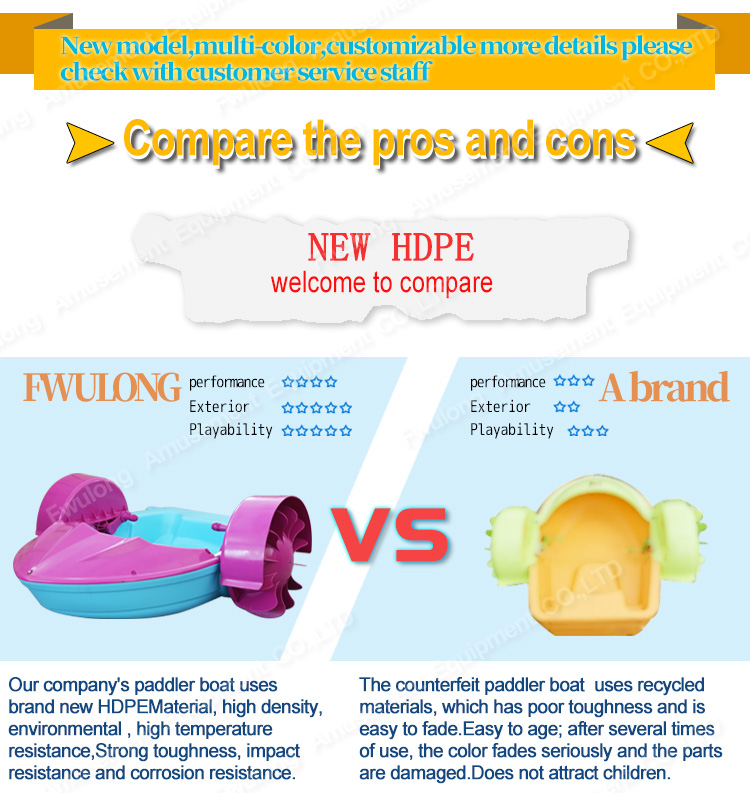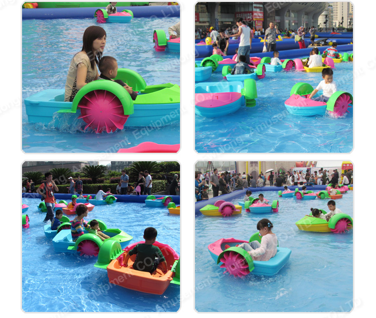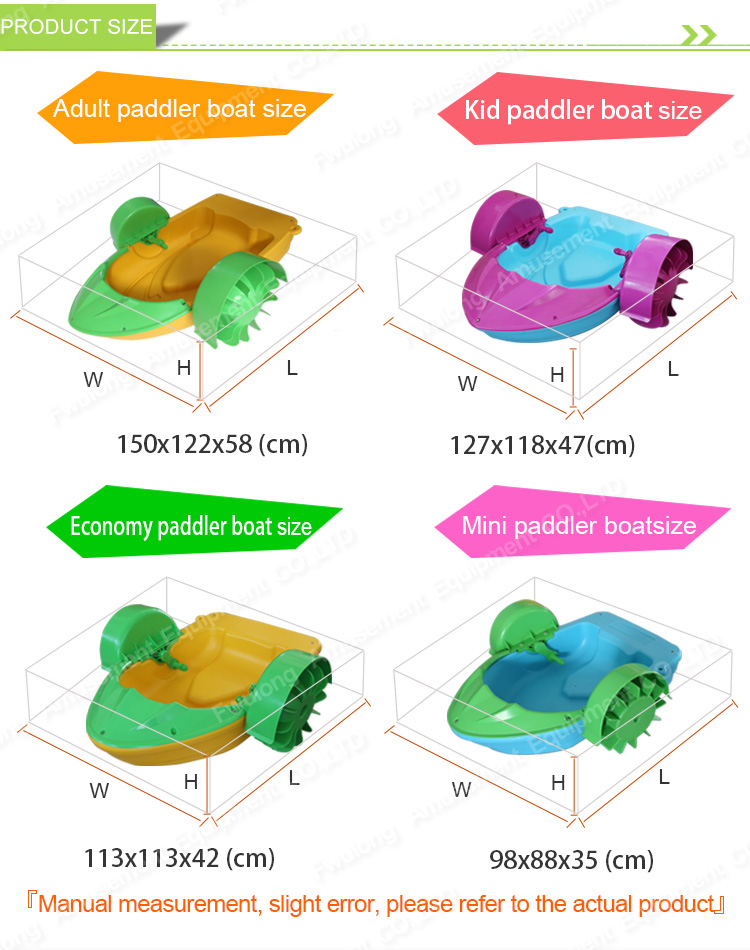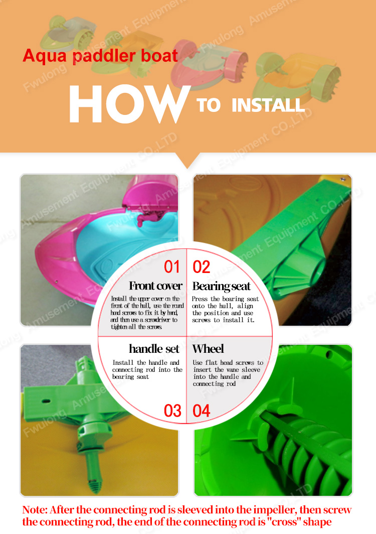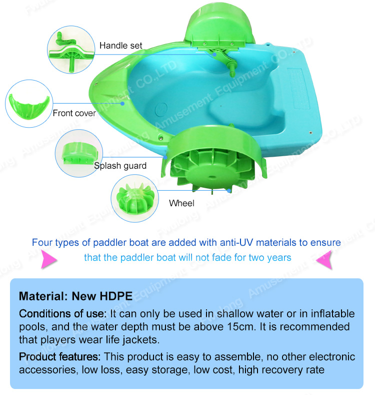 1. Our paddle boat is consist of 5 separated part: boat body, handle, wheel, front cover, splash guard.